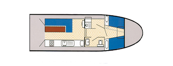 Die Burgundy 900 verfügt über eine Kabine mit zwei Einzelbetten, die bei Bedarf in ein Doppel- und Einzelbett umgewandelt werden können. Das Badezimmer an Bord ist mit Dusche und Toilette versehen. Im schönen Salon befinden sich der Steuerstand, die Küche und der Sitzbereich, der auch in ein weiteres Doppelbett umgebaut werden kann. Von hier aus gelangt man auch auf die Terrasse im Heck. Für zusätzlichen Komfort auf der Burgundy sorgt der Landstromanschluss.