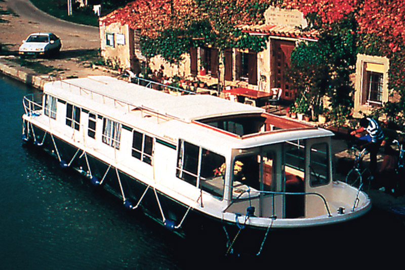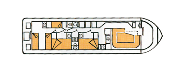 Die Eau Claire 1400 ist mit fünf Schlafkabinen ausgestattet. Die beiden hinteren Kabinen haben zwei Einzelbetten mit Umbaumöglichkeit zum Doppelbett, die beiden Kabinen in der Mitte je ein Doppelbett und die weitere Kabine in der Mitte ein Einzelbett. An Bord befinden sich zwei Badezimmer mit Dusche und Toilette. Im vorderen Teil des Schiffes finden Sie die separate Küche und den Salon mit Schiebedach und Durchgang zur Terrasse. Hier gibt es bei Bedarf weitere Schlafplätze durch die Umwandlung der Sitzecken in ein Doppel- und ein Einzelbett.