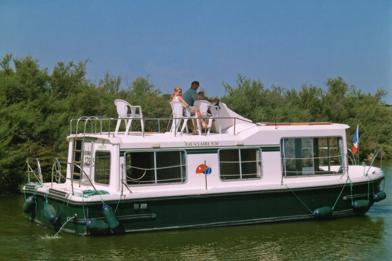 Die Eau Claire 930 Fly verfügt über eine Kabine mit einem Doppel- und einem Einzelbett, ein Badezimmer mit Dusche und WC, separate Küche sowie den Salon mit Innensteuerstand, Essbereich und Zugang zur Terrasse und zum zweiten Steuerstand im Freien. Hier gibt es bei Bedarf weitere Schlafplätze durch die Umwandlung der Sitzecken in ein Doppelbett sowie durch ein abklappbares Einzelbett.