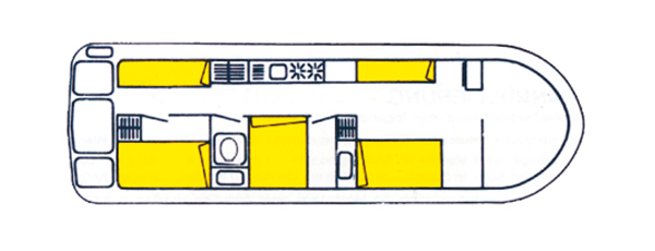 - Salon vorn mit Essecke (Umbaumöglichkeit zu Doppelbett und Einzelbett) und Führerstand