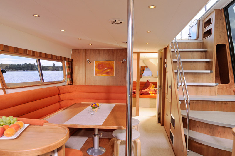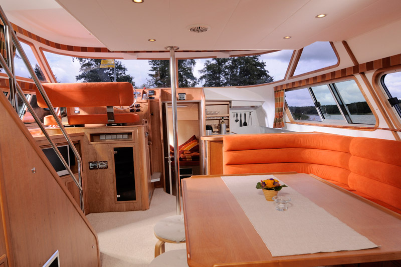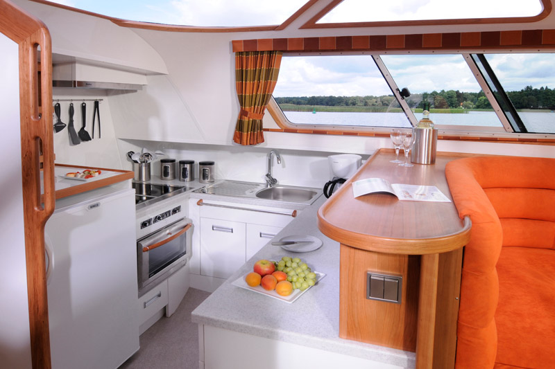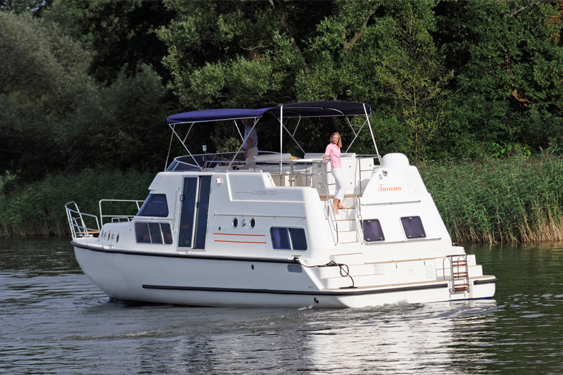 Die Europa 700 ist das größte Schiff innerhalb der Europa-Reihe und bietet für sechs Personen besonders viel Platz und höchsten Komfort. Die Kabine im Schiffsbug verfügt über ein Doppelbett, die beiden Kabinen im Heck sind mit zwei Einzelbetten ausgestattet, die sich in ein Doppelbett umwandeln lassen. Alle Kabinen haben ihr eigenes Badezimmer mit Dusche, elektrischen WC und Fön. Der große Innenbereich, wo sich der große Salon und die eingerichtete Küche befinden, bietet reichlich Blick ins Freie. Hier befindet sich auch ein Satelliten-Fernseher mit CD- und DVD-Player und MP3-Anschluss. Auf dem Teakholz-Deck, wo sich auch der Außensteuerstand befindet, finden Sie einen Essbereich, Waschbecken und einen zweiten Kühlschrank. Für zusätzlichen Komfort sorgen die Badeplattform mit Warmwasser-Dusche, die 220V-Versorgung bei laufendem Motor und ein Bug- und Heckstrahlruder, das ein noch einfacheres Navigieren zulässt.