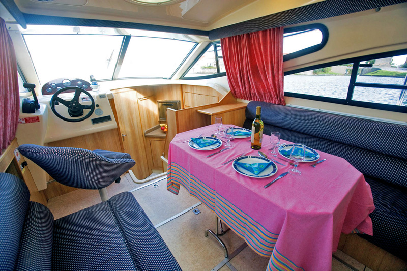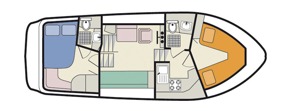 Die Consul bietet mit ihren beiden Schlafkabinen und dem geräumigen Salon bequem Platz für vier Personen. In der vorderen Kabine befinden sich zwei Einzelbetten, die zu einem Doppelbett umgewandelt werden können und in der großen hinteren Kabine ein Doppelbett. Die beiden Badezimmer sind jeweils mit Dusche und WC ausgestattet. Im Salon finden Sie den Innensteuerstand und den Essbereich und für gute Unterhaltung sorgt hier ein CD-Spieler mit MP3- und USB-Anschluss. Den Aufenthalt an Bord perfekt machen das Sonnendeck mit Außensteuerstand und Sitzecke, die Ventilatoren in allen Kabinen und der Landstromanschluss.