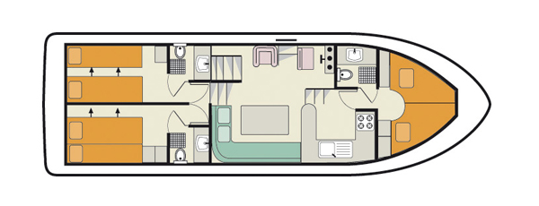 Auf der Orion finden in den drei Kabinen, die jeweils ein eigenes Badezimmer mit Dusche und WC haben, bis zu sechs Personen Platz. Bei Bedarf können zwei weitere Personen durch die in ein Doppelbett umwandelbare Sitzecke im Salon einen bequemen Schlafplatz finden. Für gute Unterhaltung sorgt der eingebaute CD-Spieler. Vom Salon aus haben Sie direkten Zugang zum großen, höher gelegenen Sonnendeck mit zusätzlichem Außensteuerstand, das Platz für alle Reisenden bietet.