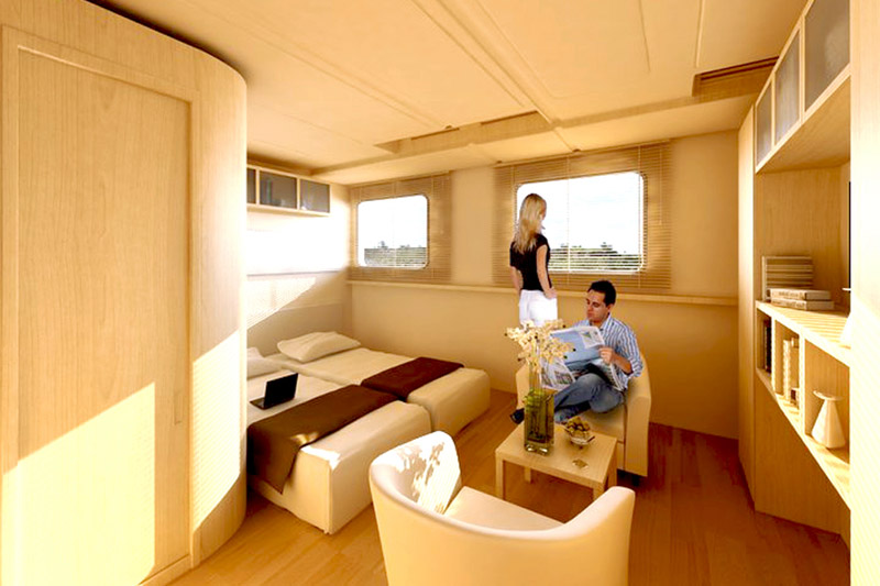 - 1 große Kabine mit 2 Einzelbetten (Umbaumöglichkeit zu Doppelbett) und zusätzlich ausklappbarem Kinderbett