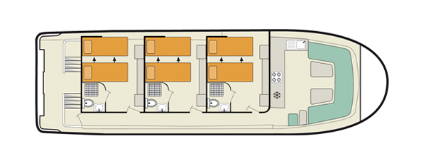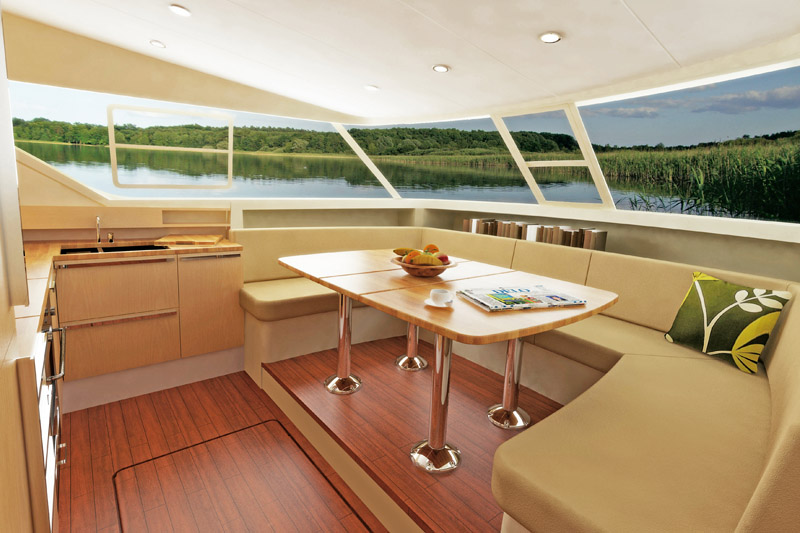 Die Boote der neuen 1500 Serie sind in Design, Form und technischer Ausstattung einzigartig und bieten außergewöhnlich viel Platz und Luxus pur. Die hotelähnlichen Kabinen sind schick und stilvoll eingerichtet und mit zwei Einzelbetten ausgestattet, die zu einem Doppelbett umgewandelt werden können. Zudem gehören zu jeder Kabine ein eigenes Badezimmer, eine individuell regelbare Klimaanlage sowie ein Flachbildschirm mit DVD-Spieler. Die Möbel sind in Holzoptik gehalten und bieten reichlich Stauraum. Im großen und komfortablem Salon finden Sie eine bogenförmige Sitzecke, der auf Wunsch in ein zusätzliches Einzelbett umgewandelt werden kann, die komplett ausgestattete Küche, den Innensteuerstand sowie zur guten Unterhaltung auch hier einen Flachbildschirm und eine Musikanlage. Im Außenbereich gibt es neben der großen Terrasse mit Sonnensegel auch einen zweiten Steuerstand, um bei gutem Wetter auch als Kapitän die Sonne genießen zu können. Weiteren Komfort bietet die neu entwickelte Steuerung per Joystick (zusätzlich zum herkömmlichen Steuerrad), der ein müheloses Manövrieren zulässt sowie das neue POD Antriebssystem und das Bugstrahlruder.