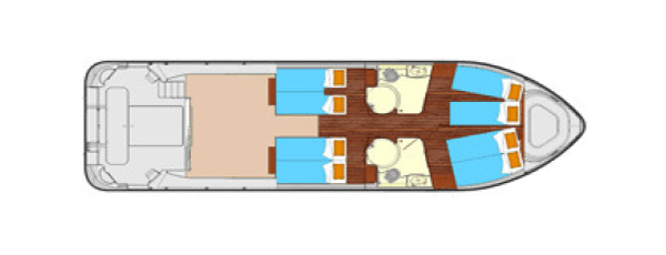 Die Octo wurde in der Saison 2010 neu in die Nicols Flotte aufgenommen. Sie besticht mit der luxuriösen Inneneinrichtung, den geräumigen Kabinen und der großen hinteren Terrasse. Auf dem Boot befinden sich insgesamt vier Kabinen mit je zwei Einzelbetten, die sich zu einem Doppelbett umwandeln lassen. Um zwei weitere Schlafplätze zu schaffen kann bei Bedarf die Sitzbank im Salon zu einem weiteren Doppelbett umfunktioniert werden. Insgesamt stehen zwei Nasszellen mit abgetrennter Dusche, WC und heizbarer Handtuchschiene zur Verfügung. Im großzügig gestalteten Salon mit Panoramablick finden Sie den Innensteuerstand, den Essbereich und einen Fernseher und Musikanlage mit Radio und CD-Spieler. Von hier aus gelangen Sie durch eine Schiebetür ebenerdig auf die große Terrasse und über eine Treppe zur höher gelegenen Außensteuerstand. Zusätzlichen Komfort an Bord bieten ein Sonnensegel, die Badeleiter, eine Außendusche, der Landstromanschluss und das Bugstrahlruder, das ein noch leichteres Navigieren des Bootes zulässt.