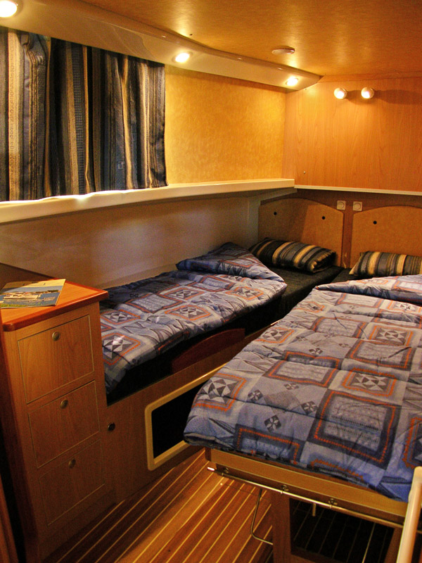 - Kabine vorn mit 2 Einzelbetten (Umbaumöglichkeit zu Doppelbett) und einhängbarem Einzelbett in halber Höhe