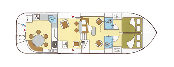 Die Snaily Hausboote mit ihren klassischen, fast zeitlosen Formen sind ideale Begleiter für Ihre Fahrt auf dem Wasser. Das Boot ist mit zwei Schlafkabinen mit je einem Doppelbett ausgestattet. Zu jeder Kabine gibt es ein dazugehöriges Badezimmer mit Dusche und Toilette. An Bord befinden sich weiterhin zwei schöne Salons, wovon einer mit dem sogenannten cliq-claq-Sofa möbliert ist, welches mit einem Handgriff in ein bequemes Doppelbett umgewandelt werden kann. Zur großen und gut ausgestatteten Küche mit eingebautem Kaminofen fügt sich ein Essbereich an. Im Außenbereich befinden sich die im Bug eingebaute Tischgruppe mit Sonnenschirm und die Flying-Bridge mit zweitem Steuerstand, gepolsterten Ruheflächen und aufklappbarem Sonnendach. Weiteres Highlight im Außenbereich ist die Warmwasserdusche. Um das Boot noch einfacher navigieren zu können, wurde das Boot mit einem Bugstrahlruder ausgestattet.