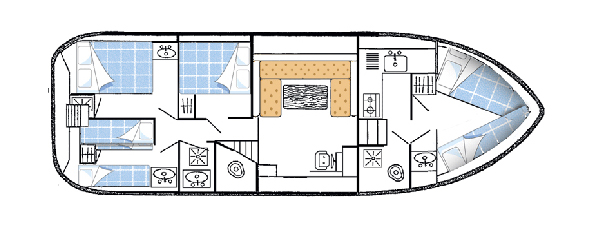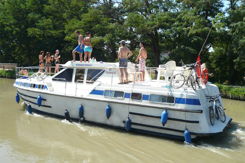 Die Tarpon 42 N ist optimal für große Gruppen geeignet und verfügt über insgesamt vier Kabinen und zwei Badezimmer mit Dusche und WC. Die vordere Kabine verfügt ein Doppelbett und ein Einzelbett in halber Höhe, die hinteren Kabinen über Doppelbetten bzw. über Stockbetten mit zusätzlichem Einzelbett. In der Mitte des Bootes liegt neben der separaten, gut ausgestatteten Küche der großzügige Salon mit Innensteuerstand und Sitzecke, die bei Bedarf in ein zusätzliches Doppelbett umgewandelt werden kann. Im Außenbereich befindet sich neben der Terrasse mit zweitem Steuerstand auch ein großes Sonnendeck, von wo aus Sie den tollen Blick auf die Flusslandschaft genießen können. Für ein noch einfacheres Navigieren des Bootes finden Sie selbstverständlich ein Bugstrahlruder an Bord. Im Vergleich zur Tarpon N ist dieses Boot die ältere Version.