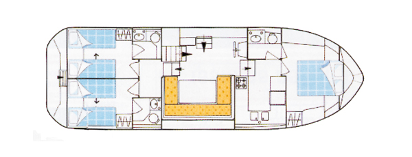Die Tarpon 42 Trio Prestige ist mit ihren drei Schlafkabinen idealerweise für sechs Personen geeignet. Durch Umwandlung des Essbereichs im Salon in ein Doppelbett können zwei weitere Personen einen Schlafplatz finden. Die vordere Kabine ist mit einem Doppelbett ausgestattet, die beiden hinteren mit je zwei Einzelbetten, die auf Wunsch in ein Doppelbett umgebaut werden können. Insgesamt befinden sich an Bord je drei Duschen und elektrische Toiletten. Zusätzlichen Komfort bietet die Klimaanlage (außer in Deutschland) sowie der Landstromanschluss und das Bugstrahlruder, das ein noch einfacheres Navigieren zulässt. Für gute Unterhaltung sorgt zudem ein Radio mit CD-Spieler. Im Außenbereich befindet sich neben der Terrasse mit zweitem Steuerstand auch ein großes Sonnendeck, von wo aus Sie den tollen Blick auf die Flusslandschaft genießen können.