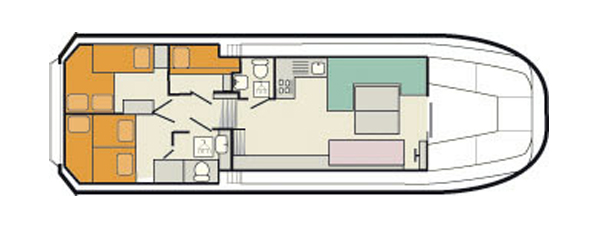 Die Vetus 1200 bietet viel Platz in der Küche und im Salon und ist daher ein ideales Boot für Familien. Das Boot verfügt über zwei Kabinen mit je zwei Einzelbetten und einem weiteren Einzelbett oder Kinderbett in halber Höhe. Beide Kabinen haben direkten Zugang zum jeweils angrenzenden Badezimmer mit Dusche und WC. Zusätzlich kann die Sitzecke im Salon zu einem Doppelbett umgewandelt werden, um zwei weitere Schlafplätze zu schaffen. Vom Salon aus besteht ein direkter Zugang zum Sonnendeck mit zweitem Steuerstand. Zum einfacheren Navigieren befindet sich auch ein Bugstrahlruder an Bord.