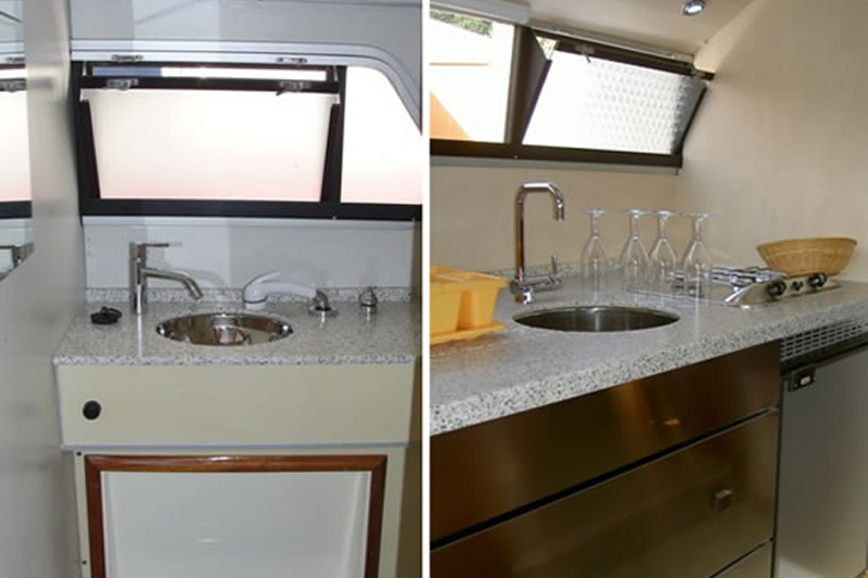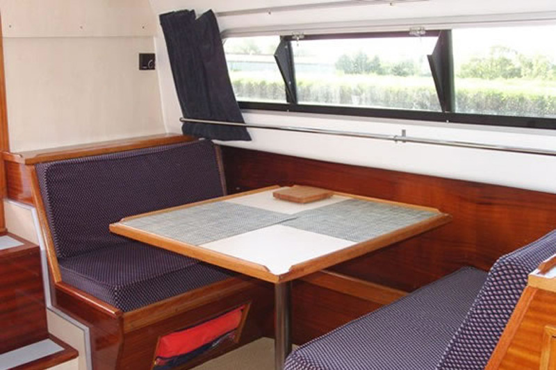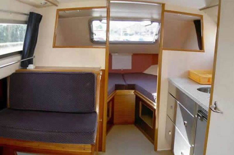 Die Navig 27 ist das ideale Boot für zwei Personen. Die Schlafkabine im Schiffsbug ist mit zwei Einzelbetten möbliert. In der Schiffsmitte befindet sich neben dem Badezimmer mit Dusche und Toilette der Salon mit gut ausgestatteter Küche und Essbereich, der bei Bedarf in ein weiteres Einzelbett umgewandelt werden kann. Gesteuert wird die Navig 27 vom Hinterdeck mit abnehmbarer Plane aus.