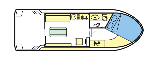 Die Riviéra 750 ist idealerweise für zwei Personen geeignet, die ihren Schlafplatz in der Kabine im vorderen Teil des Schiffes finden. Bei Bedarf kann noch eine weitere Person nach Umwandlung der Sitzecke im Salon in ein Einzelbett Platz an Bord finden. Das Badezimmer ist mit Dusche, WC und Waschbecken ausgestattet. Im Salon finden Sie die Küche, den Essbereich und den Führerstand. Durch eine verglaste Schiebetür gelangen Sie von hier aus auf die Terrasse im Heck.