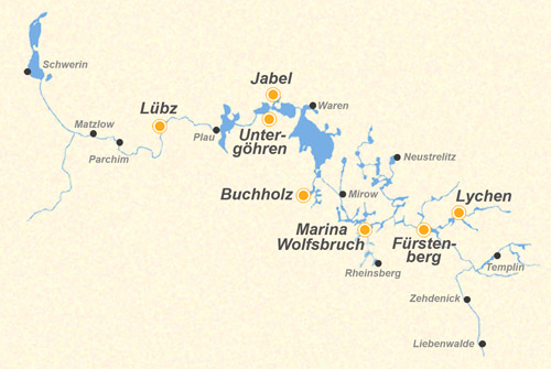 Abfahrtsorte in dieser Region: Buchholz, Fürstenberg, Jabel, Lübz, Lychen, Marina Wolfsbruch, Untergöhren
