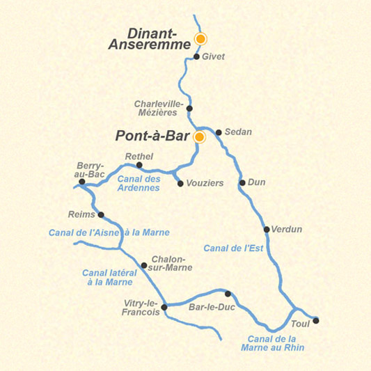 An die sehenswerten Städte Verdun und Sedan mit der größten mittelalterlichen Festungsanlage Europas haben viele französische und deutsche Familien leidvolle Erinnerungen. Bei Sedan geht der Kanal in die Maas über, die in gewundenen Schleifen an den Höhenzügen der Ardennen entlang nach Belgien fließt. Etwa 20 km nordwestlich von Sedan passiert man die Départementshauptstadt Charleville-Mézières. Von herausragender kultureller Bedeutung ist hier das Weltfestival der Marionettentheater (Festival Mondial des Théâtres de Marionettes). Das Festival findet allerdings nur im dreijährigen Turnus statt. Nach weiteren etwa 20 km kommt man durch den kleinen Ort Bogny-sur-Meuse. Hier gibt es das größte und mit 50 Tonnen wohl auch schwerste Wildschwein zu bestaunen - allerdings aus Stahl, eine künstlerische Dokumentation des Wildreichtums der Region.